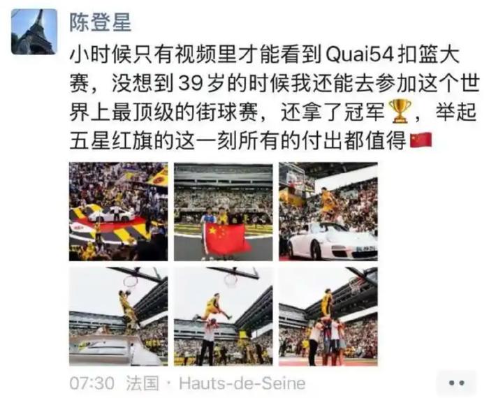而夺冠后,陈登星本人也在社交媒体激动发文:“小时候只有视频里才能看到Quai54扣篮大赛,没想到39岁的时候我还能去参加这个世界上最顶级的街球赛,还拿了冠军些,举起五星红旗的这一刻所有的付出都值得。”字里行间难掩其发自肺腑的感动和二十年如一日的坚持。