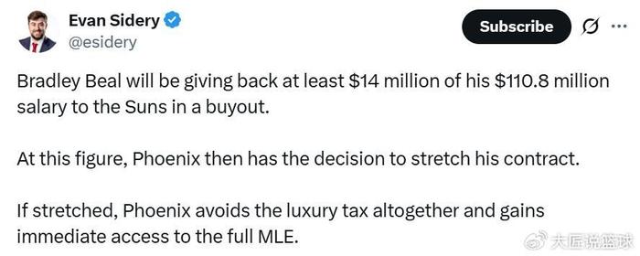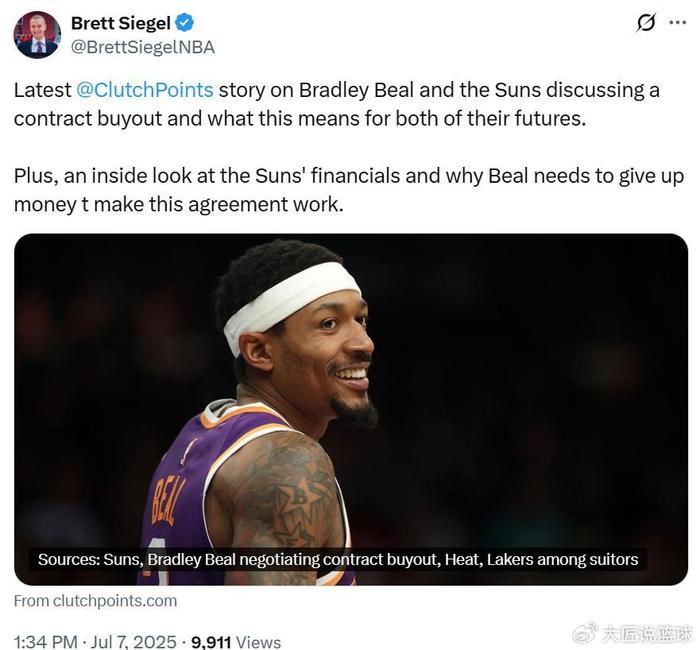 继利拉德被雄鹿队利用延伸条款买断后,比尔与太阳也计划通过这一条款买断,以释放空间继续补强。