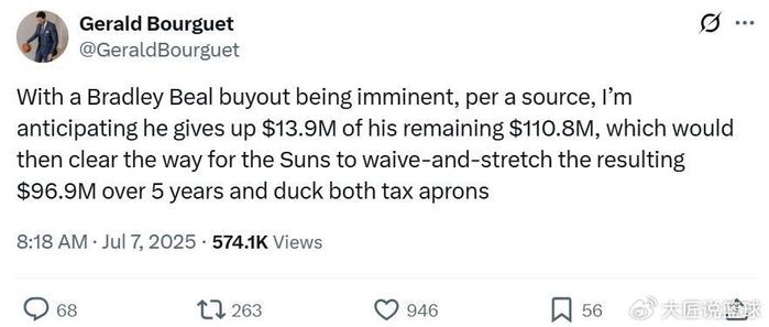 名记Marc Stein和太阳记者Gerald Bourguet也先后确认消息真实性,并且进一步明确比尔放弃的是1.108亿合同中的1390万美元。