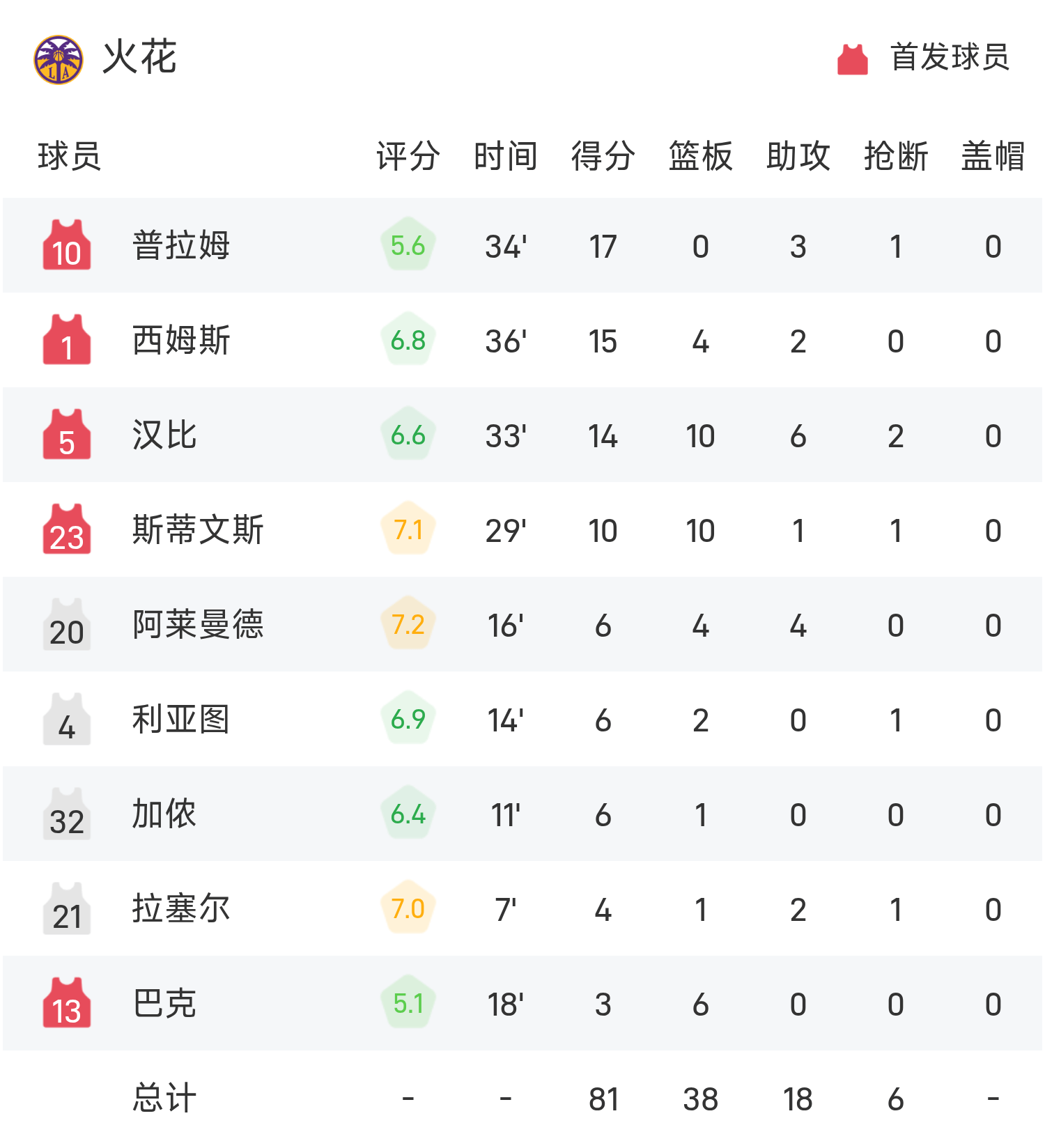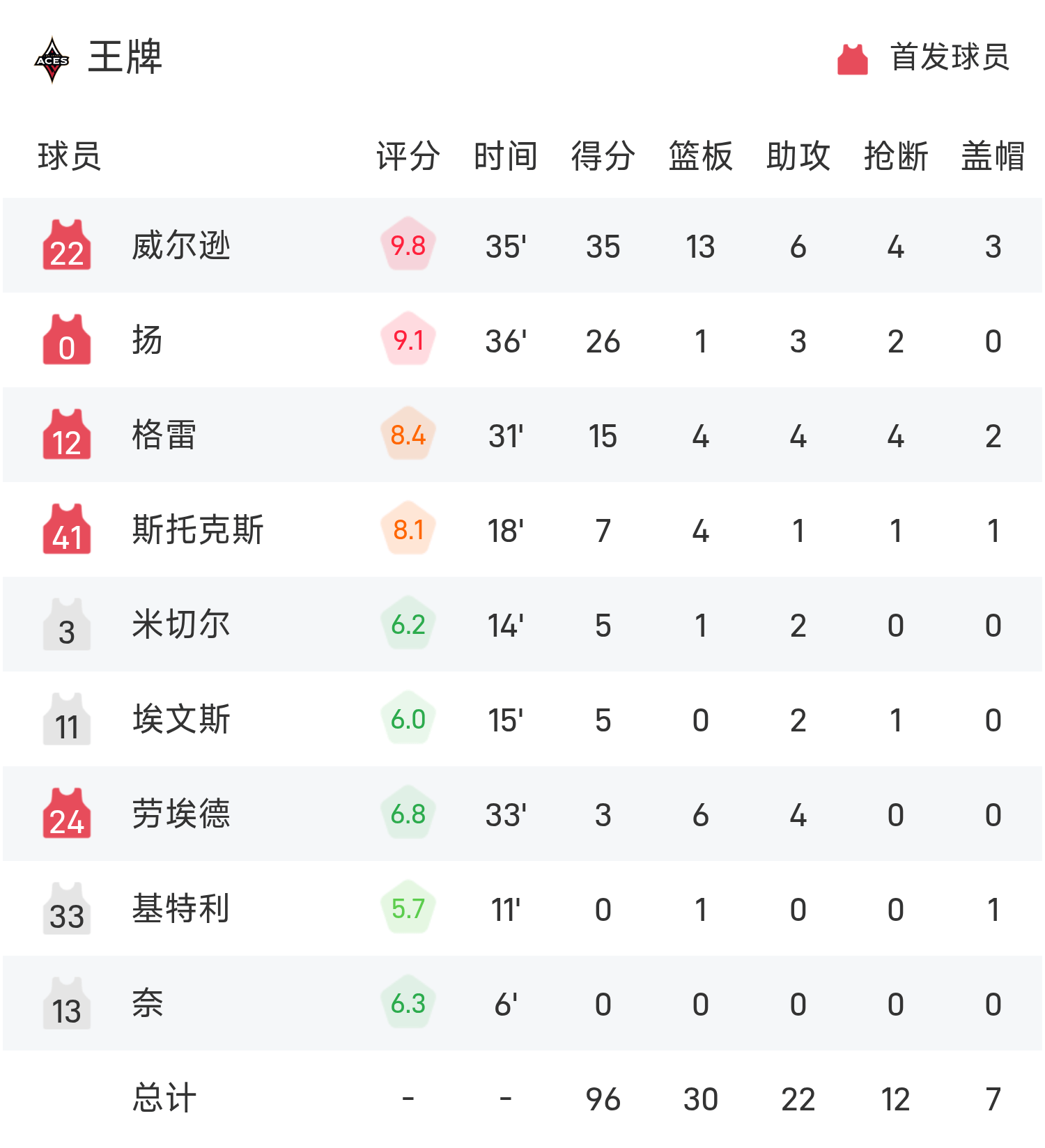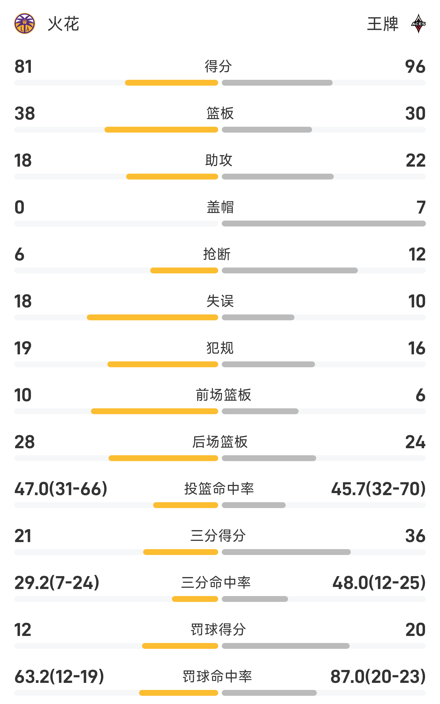 文章目录 [+] 05月31日讯 25赛季WNBA 常规赛,王牌对阵火花。双方全场战罢,王牌96-81战胜火花。威尔逊砍下全场最高的35分13板6助,率领王牌成功取胜。球员数据 查看更多详细数据 查看更多